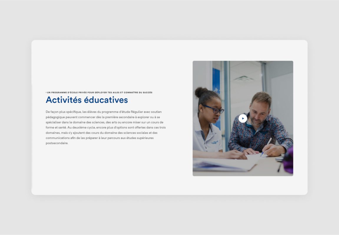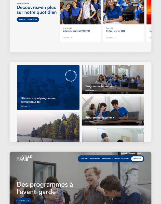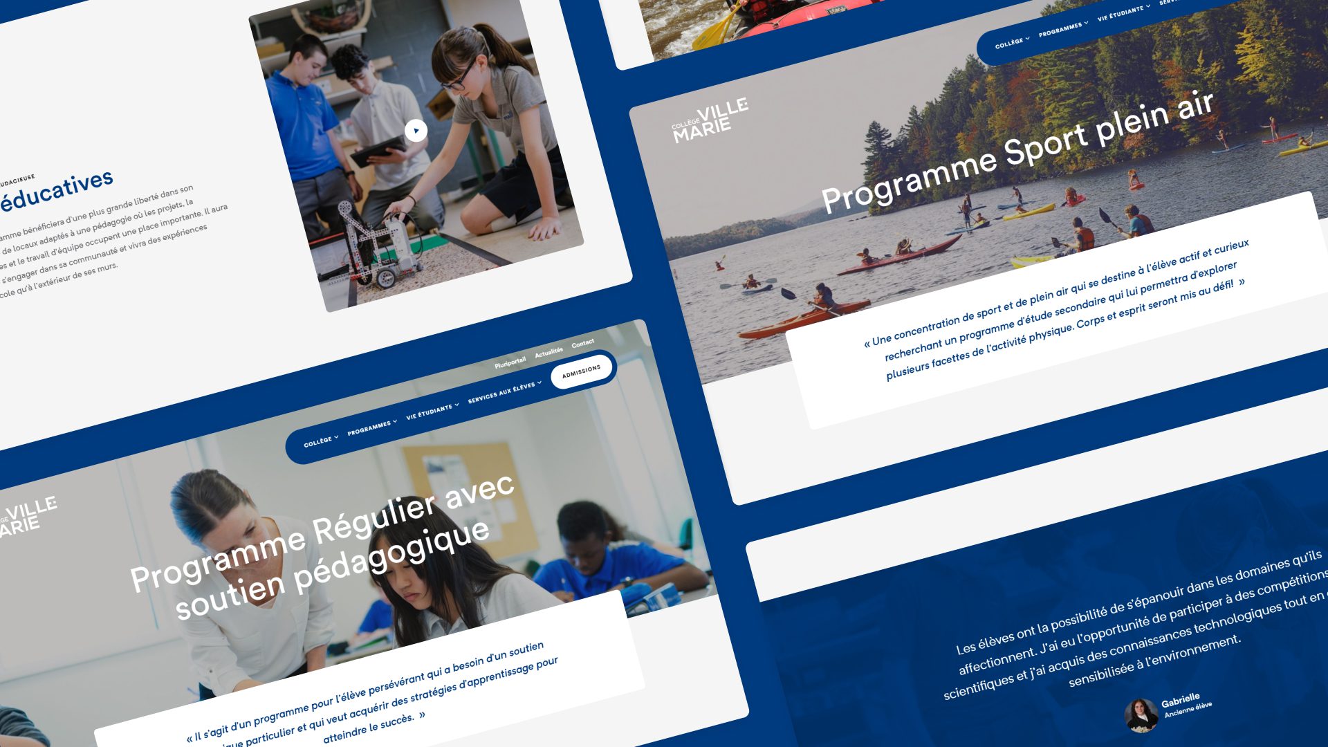 The variety of programs makes up the service offering of Collège Ville-Marie. They provide educational services that are divided into four pedagogical facets that stand out. Therefore, we built attractive and detailed program pages that act as landing pages so they can use them in their digital marketing campaigns. The list of programs is also found in multiple places on the website, making it impossible to miss and easy to share.