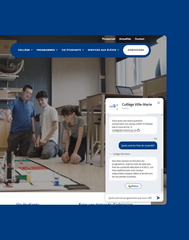 The Collège Ville-Marie team had realized that, especially as the admission and/or back-to-school period approached, they were receiving too many email questions to efficiently respond to. Therefore, we created a super-friendly conversational robot to answer the most frequently received questions. The robot recognizes several key words and short phrases and adapts its response based on the user’s query.