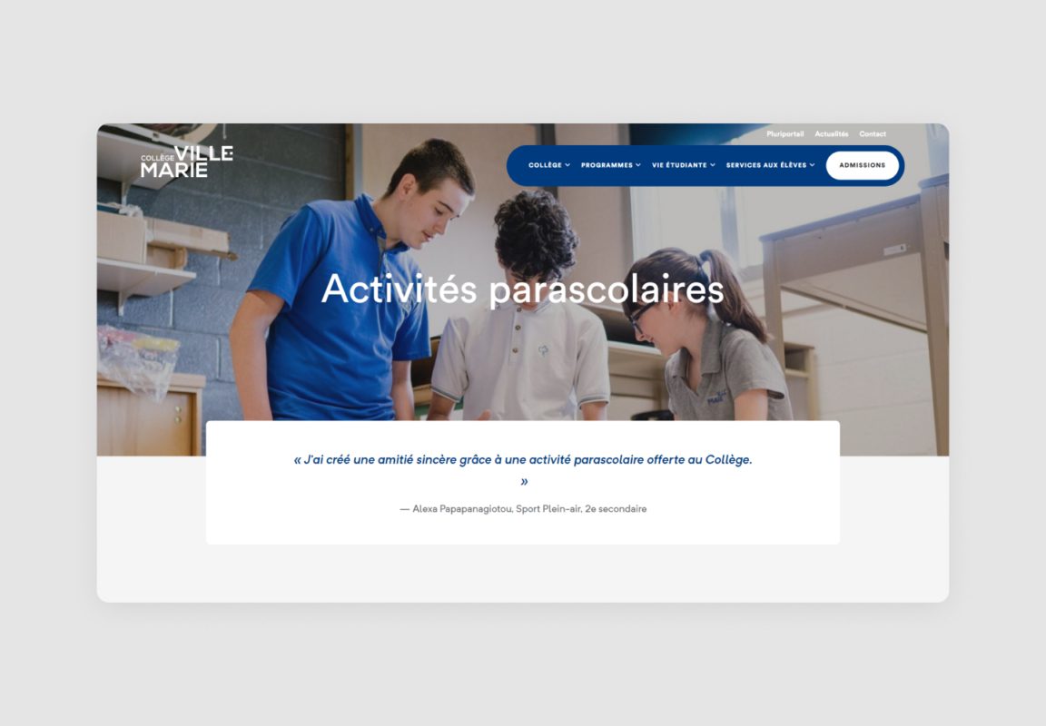 Collège Ville-Marie previously had a cluttered hierarchy where each page contained a lot of information, making the website complicated and heavy for users. The content of the new website has been tailored to both parents, to reassure and convince them that it is a good choice for their child, and to young people, to encourage them to choose CVM for their secondary education.