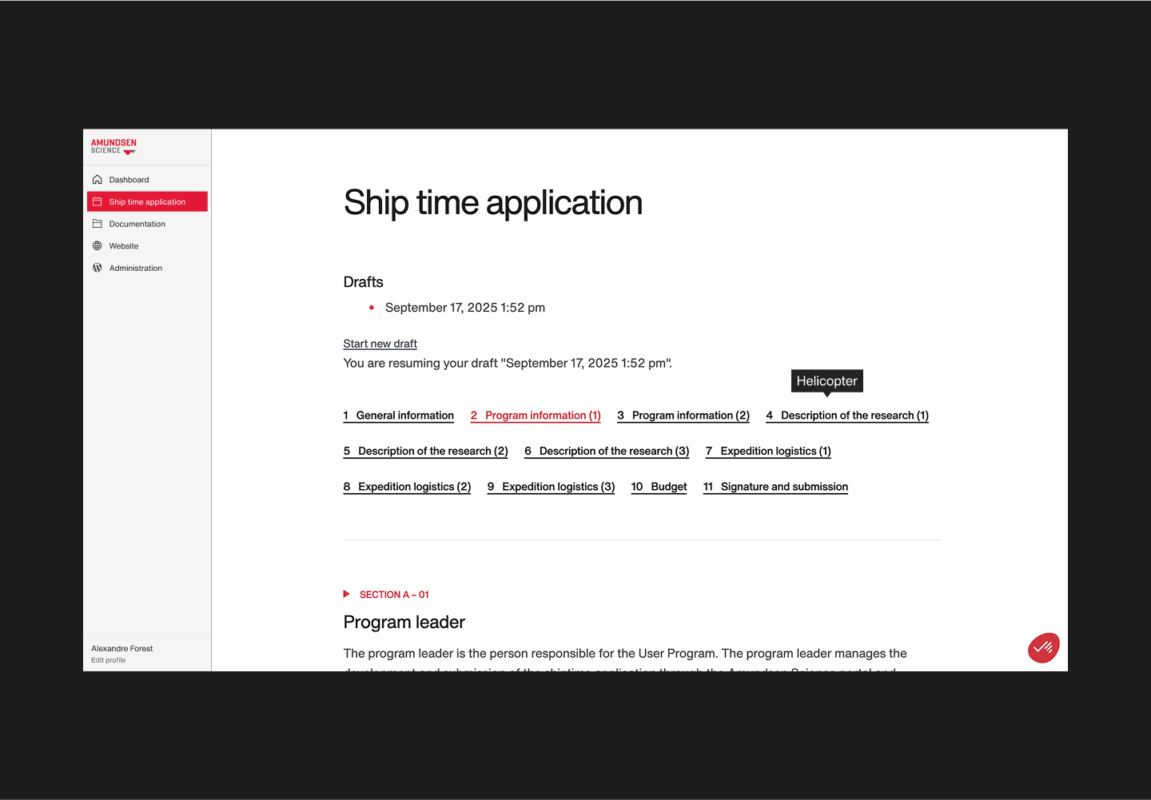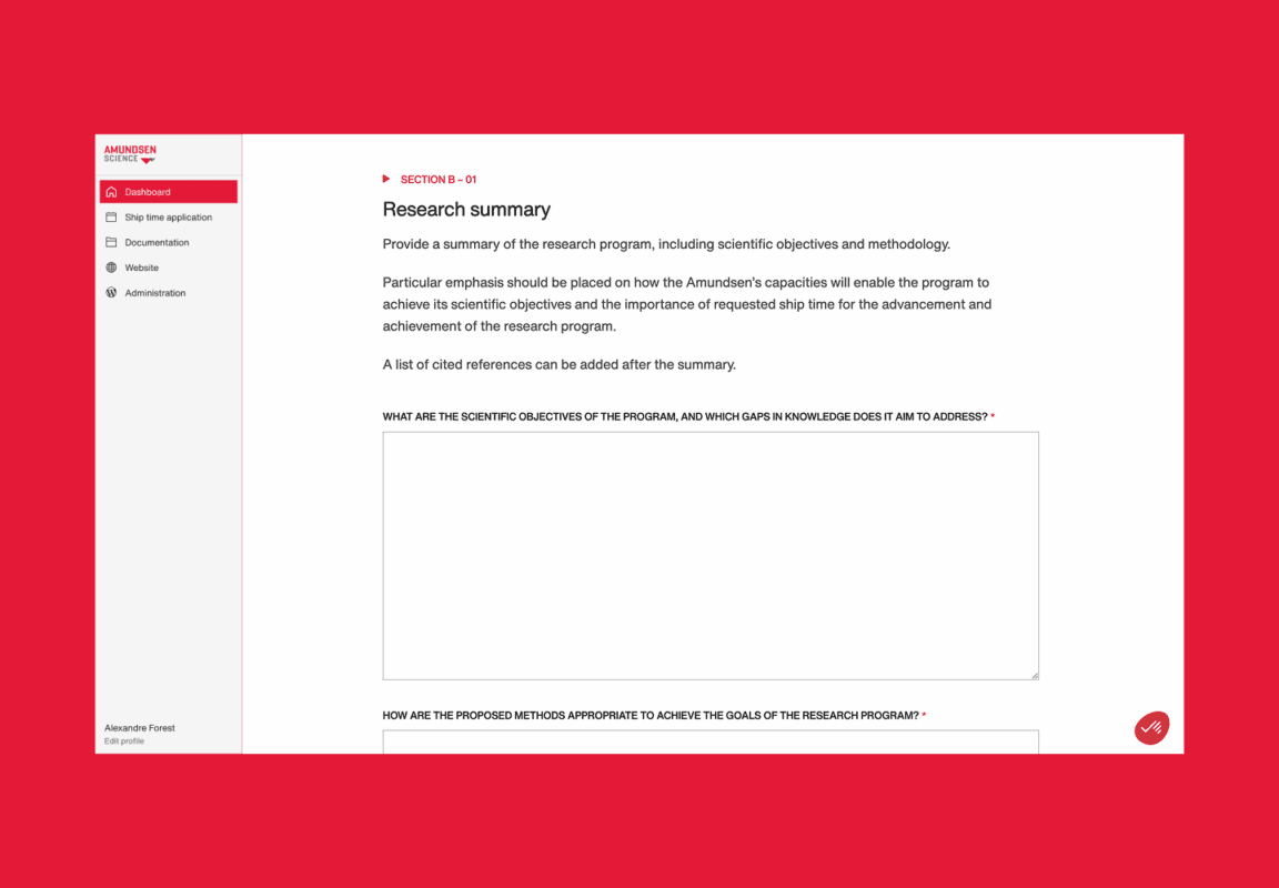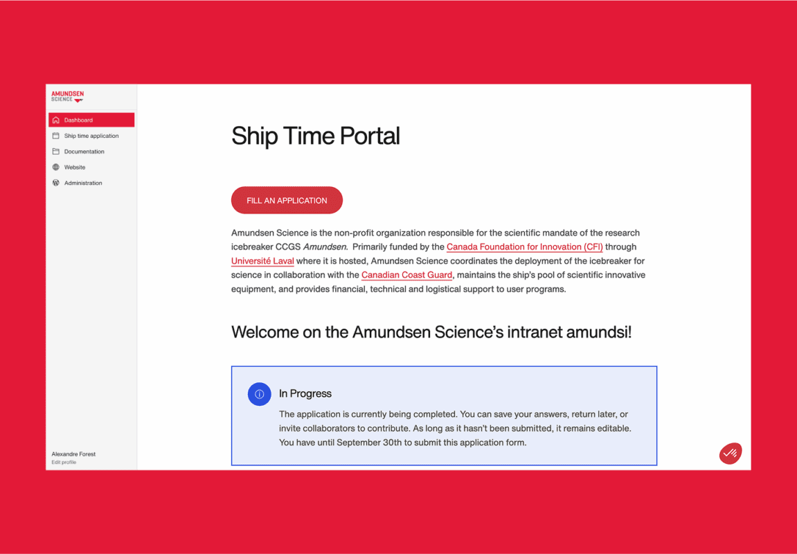 Avant la mise en place de cette solution, les scientifiques souhaitant réaliser des recherches sur l’Amundsen devaient remplir un formulaire au format .pdf et l’envoyer par courriel. Ce procédé manuel entraînait de nombreux allers-retours, des erreurs et une certaine confusion entre les scientifiques et l’équipe d’Amundsen Science.