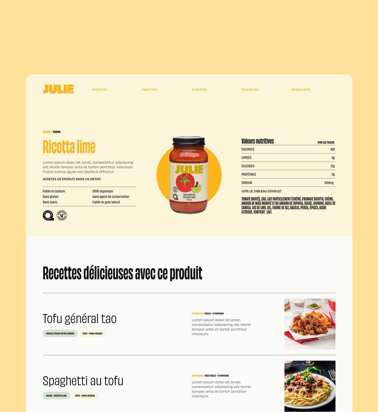 Rares sont les consommateurs qui passent énormément de temps à magasiner en ligne leur prochain pot de sauce tomate. Dans le but d’optimiser chaque seconde de navigation et d’offrir une vitrine pertinente sur les produits, on a créé un aperçu de produits concis et accrocheur qui répond aux interrogations les plus populaires de nos différentes cibles (du curieux au végétarien aguerri). Les pages produits offrent également un accès à la plateforme transactionnelle de Métro mon épicier.