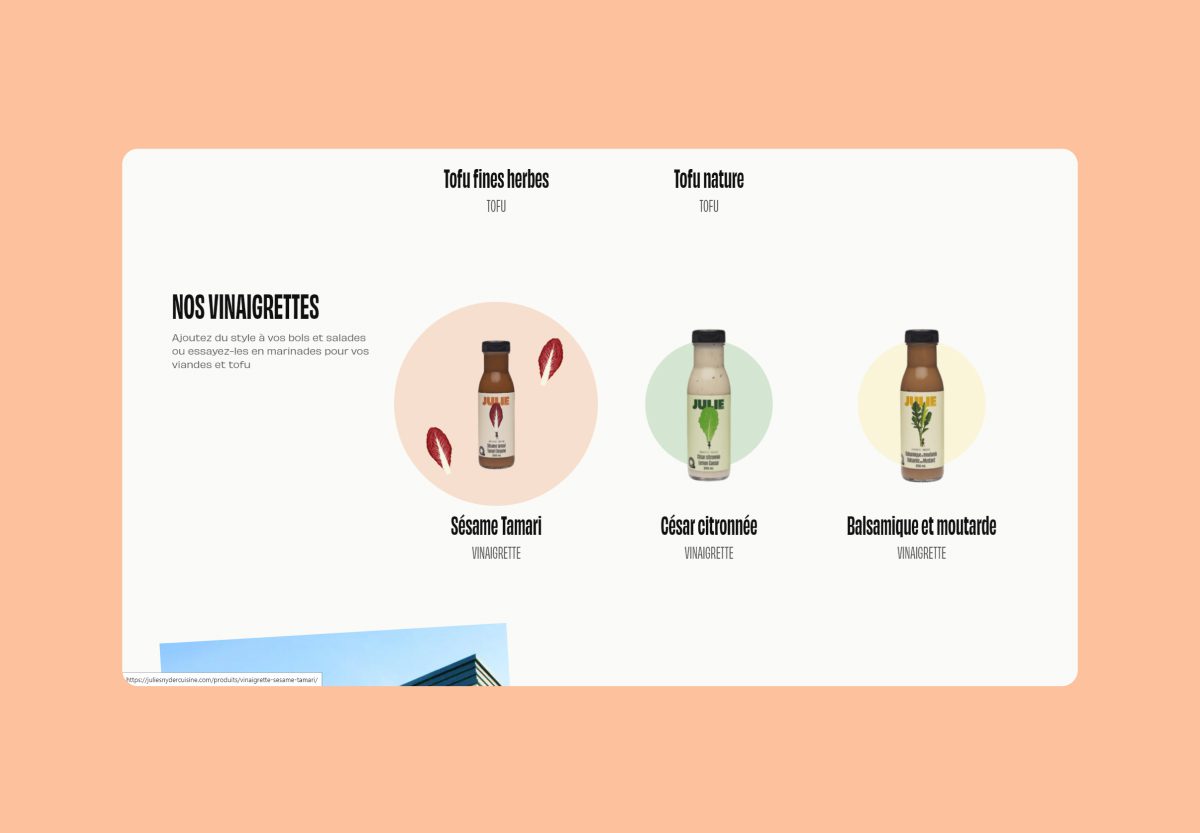 La marque Julie Snyder Cuisine est colorée et incarne l’extravagance de sa fondatrice. La marque se présente sous une palette de couleurs variées et inclusives pour communiquer au large public qu’elle souhaite rejoindre. Pour faire vivre une expérience haute en couleur aux utilisateurs, on a décidé d’exploiter toutes les teintes de la marque en instaurant un système de couleurs aléatoires. À chaque clic sur une nouvelle page, l’utilisateur est donc plongé dans une page d’une toute nouvelle couleur qui est sélectionnée aléatoirement. Lors d’une seconde visite, les couleurs changeront à nouveau, offrant ainsi à chaque visite une expérience unique et accrocheuse.