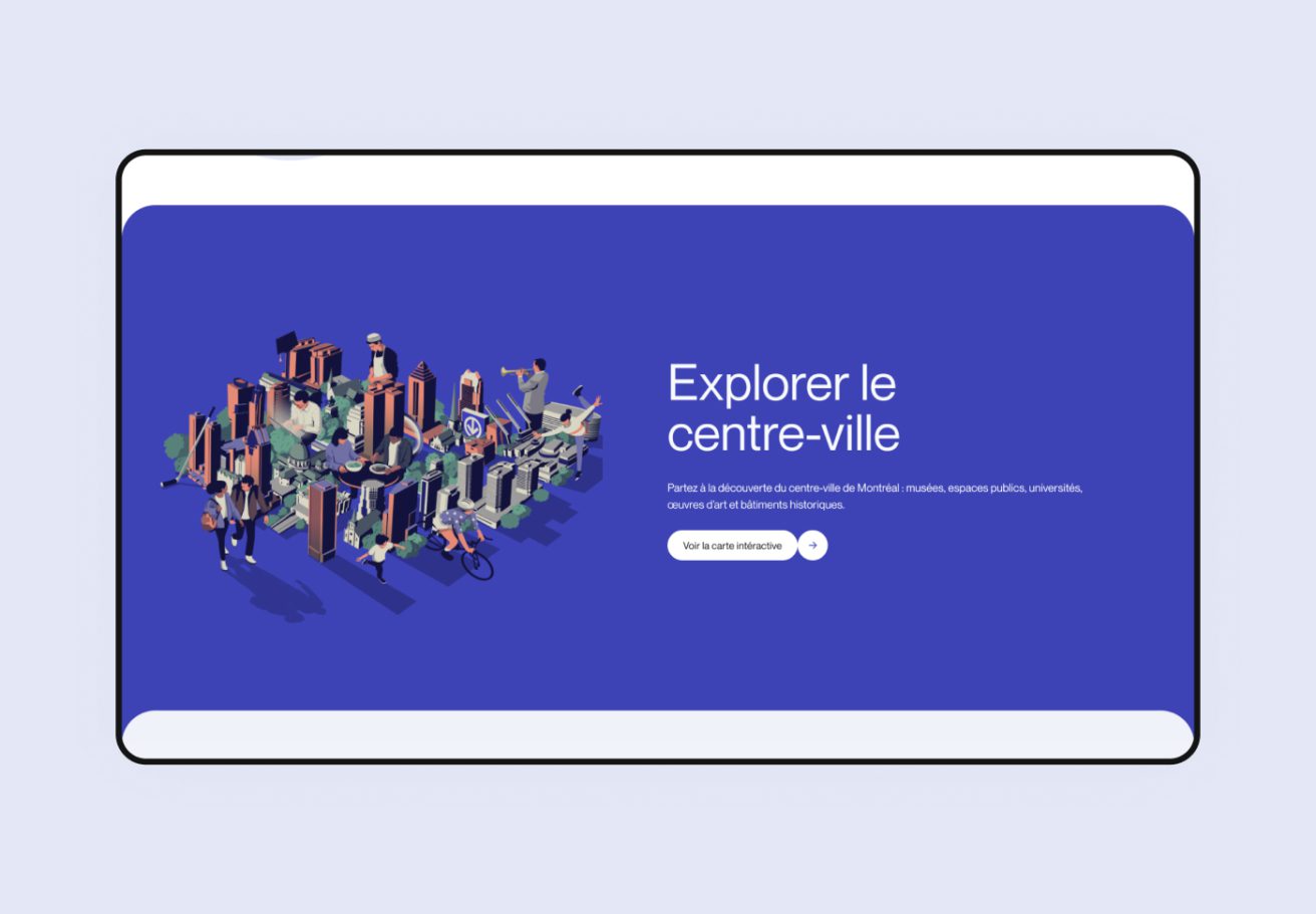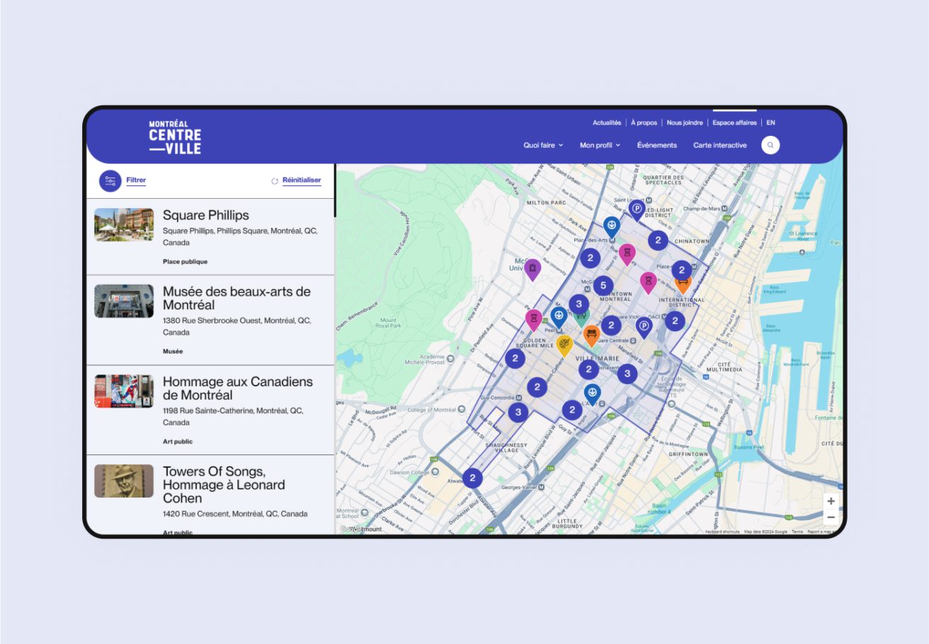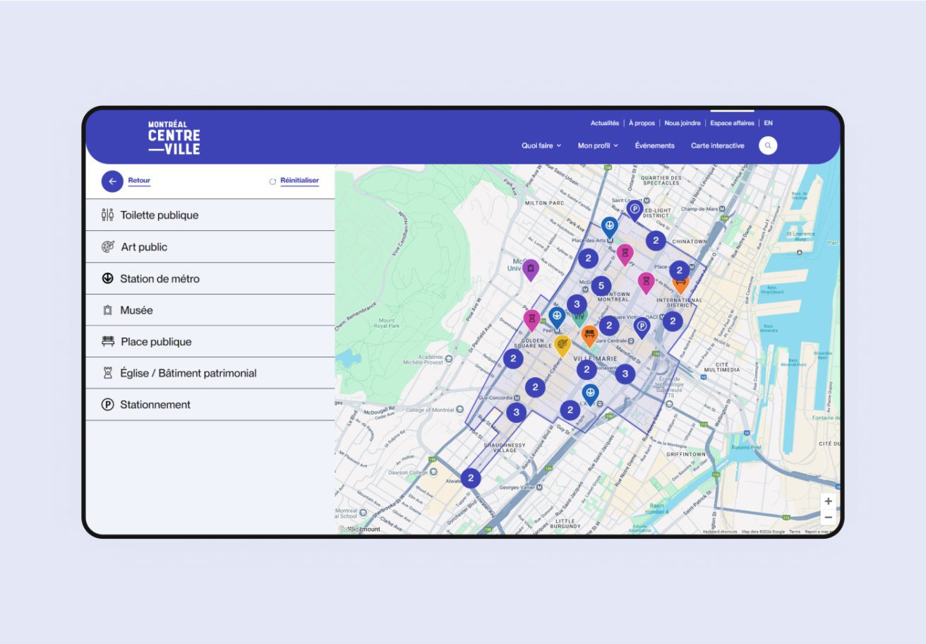 Une carte interactive liée à Google a été mise en place pour permettre aux utilisateurs de découvrir le centre-ville et tous ses attraits. À l’aide de pastilles colorées et d’iconographie personnalisée, les utilisateurs peuvent rapidement repérer : les pièces d’art public, les stations de métro, les musées, les toilettes publiques, les bâtiments patrimoniaux et bien plus encore. Le territoire du centre-ville de Montréal a également été bien délimité afin d’offrir une compréhension marquée du territoire travaillé. Évidemment, la carte offre le même confort de navigation en mobile également pour permettre aux utilisateurs de trouver un lieu rapidement, même lorsqu’ils sont déjà en plein coeur du centre-ville.